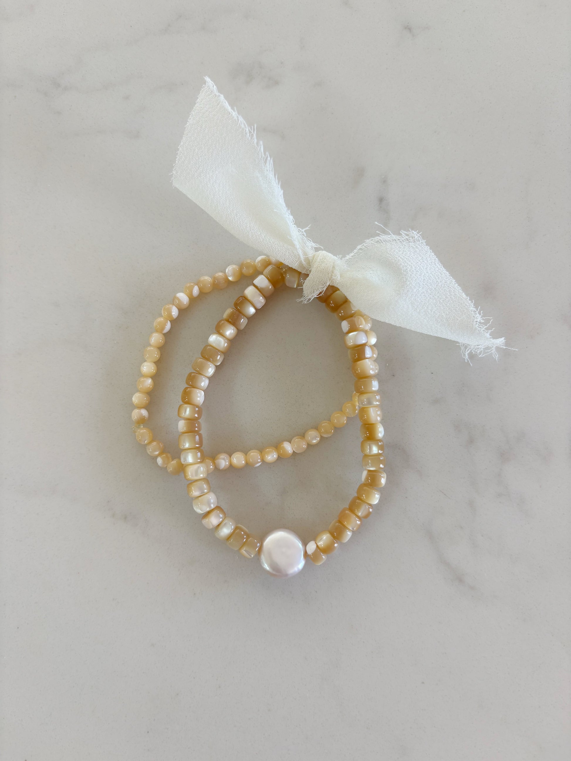 set of two Caramel colored natural shell beaded bracelets with freshwater pearl.