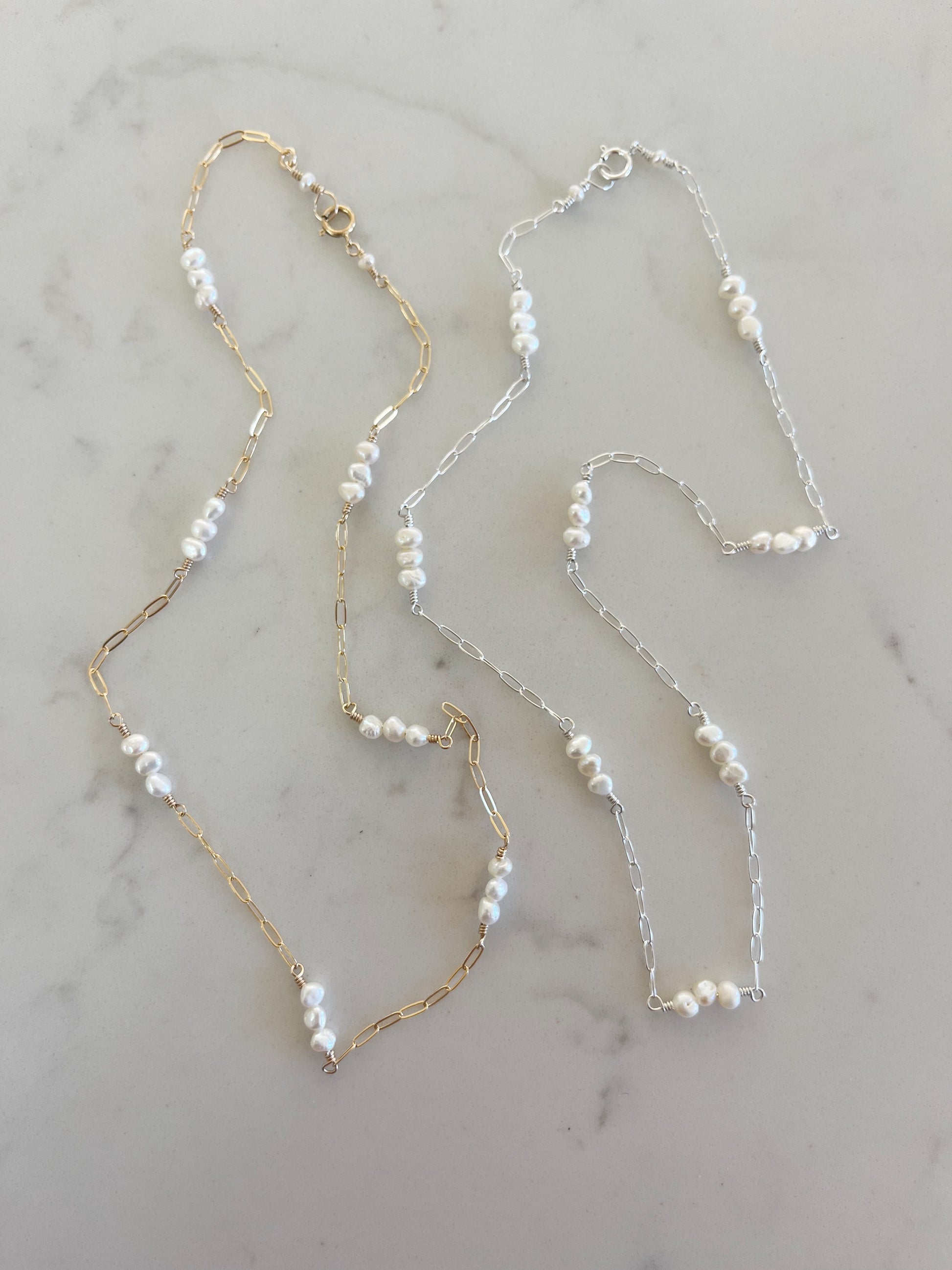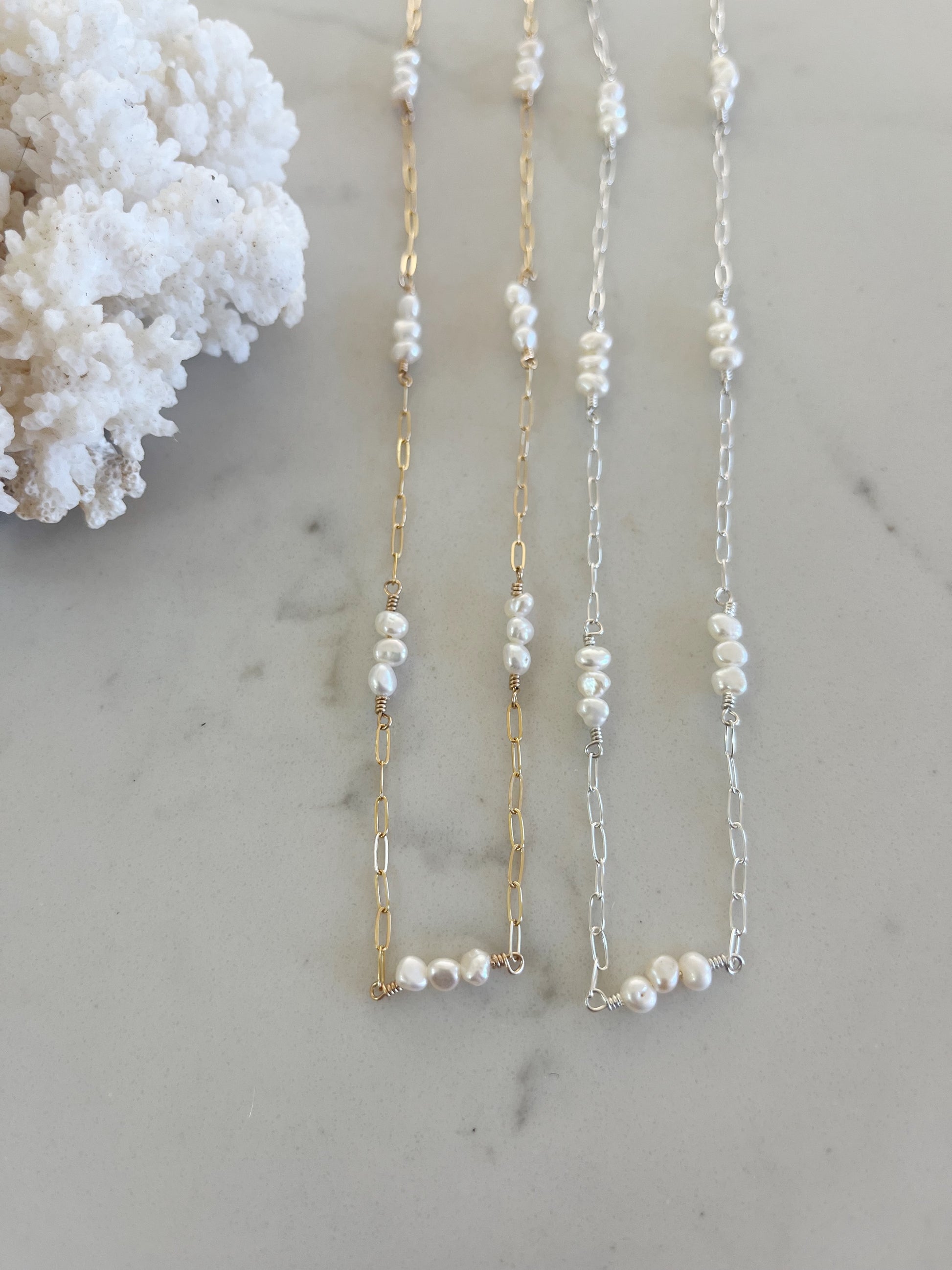 Gold filled Paperclip chain + grunions freshwater pearls
