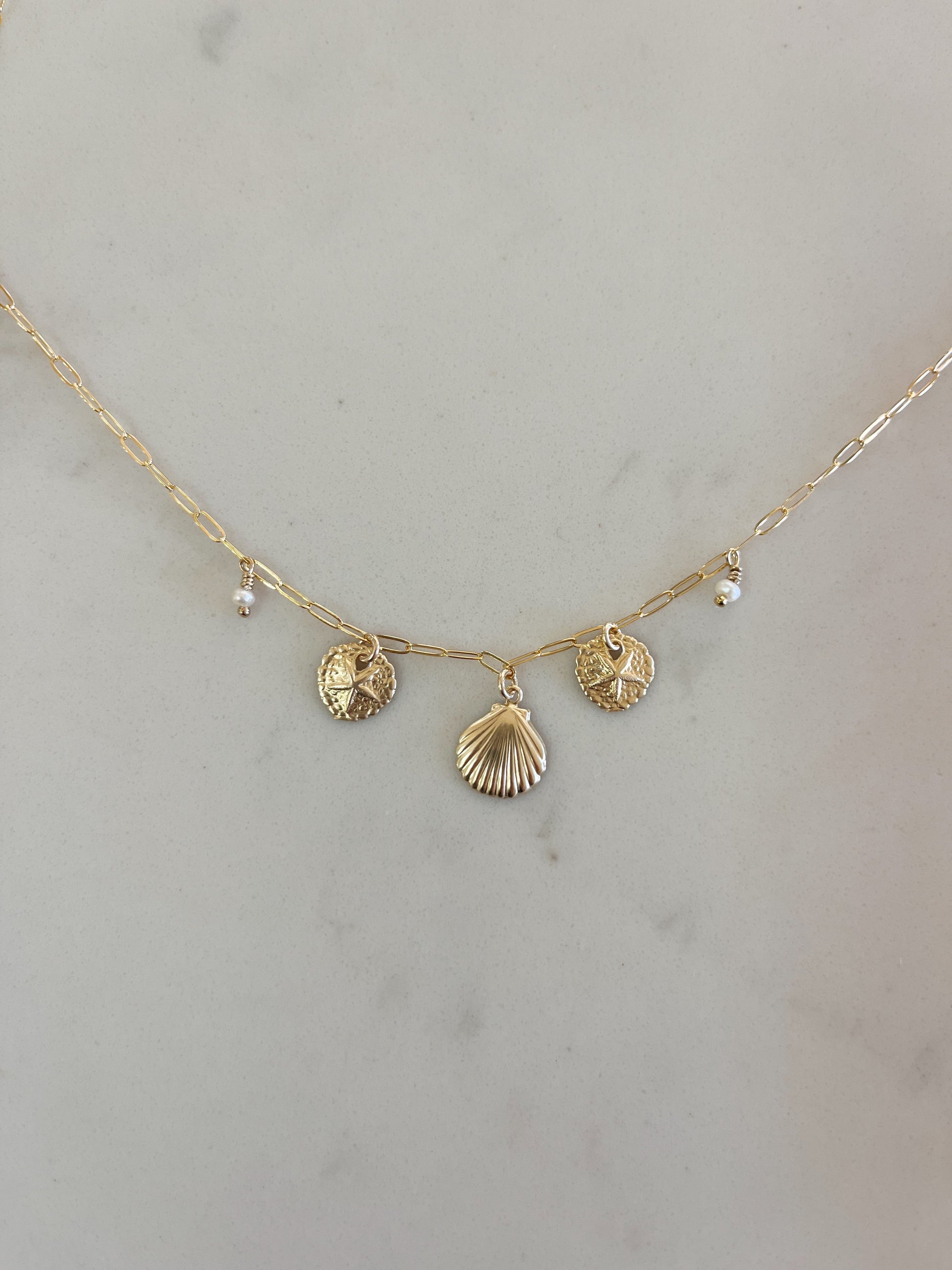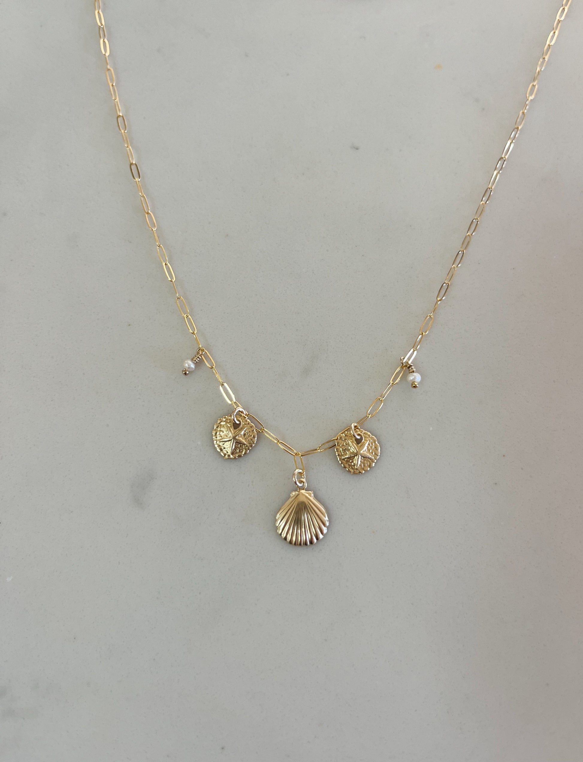 Seashell Charm Necklace: made with 14k gold filled seashell and sand Dollar charms and tiny white freshwater pearls