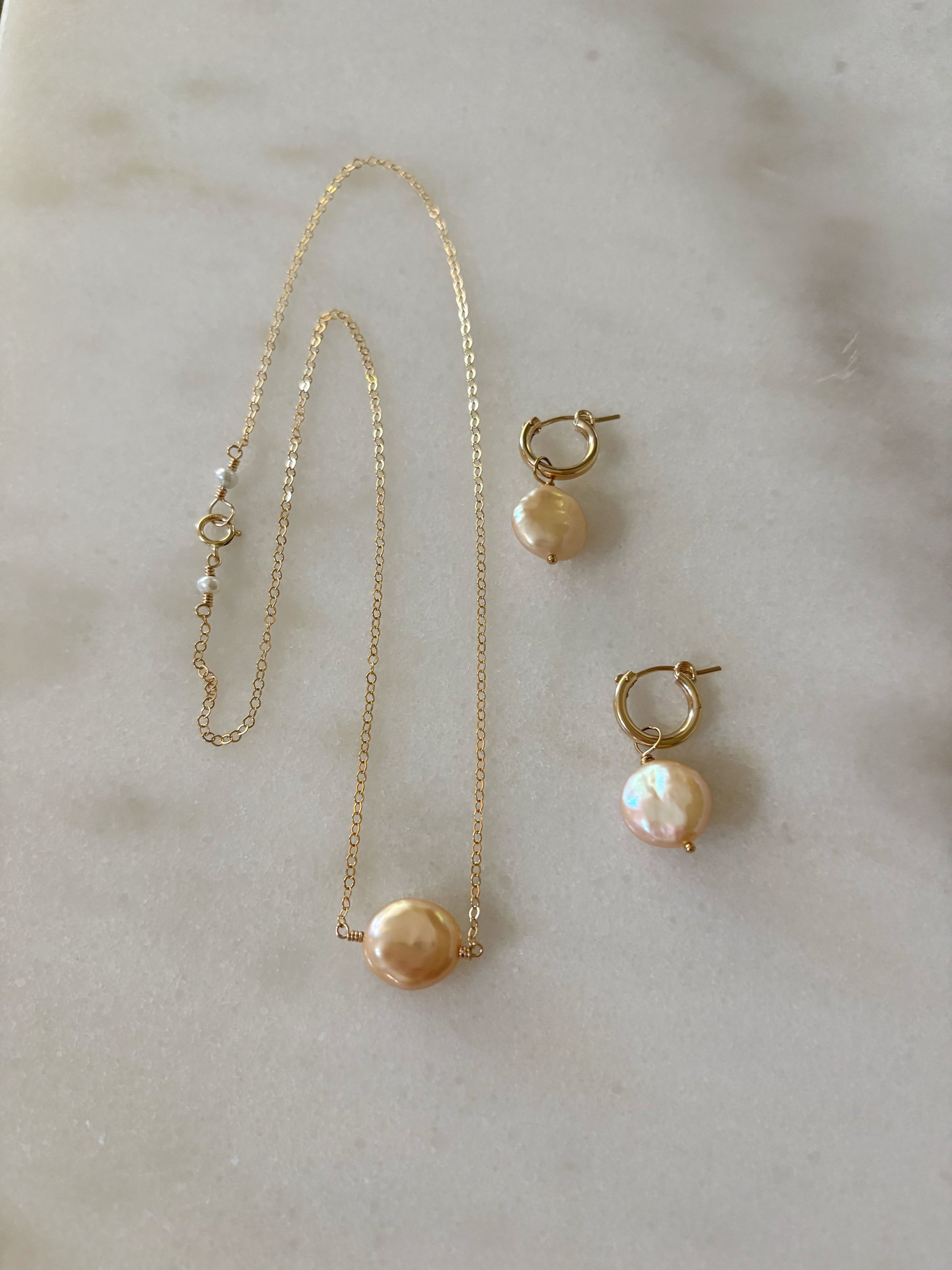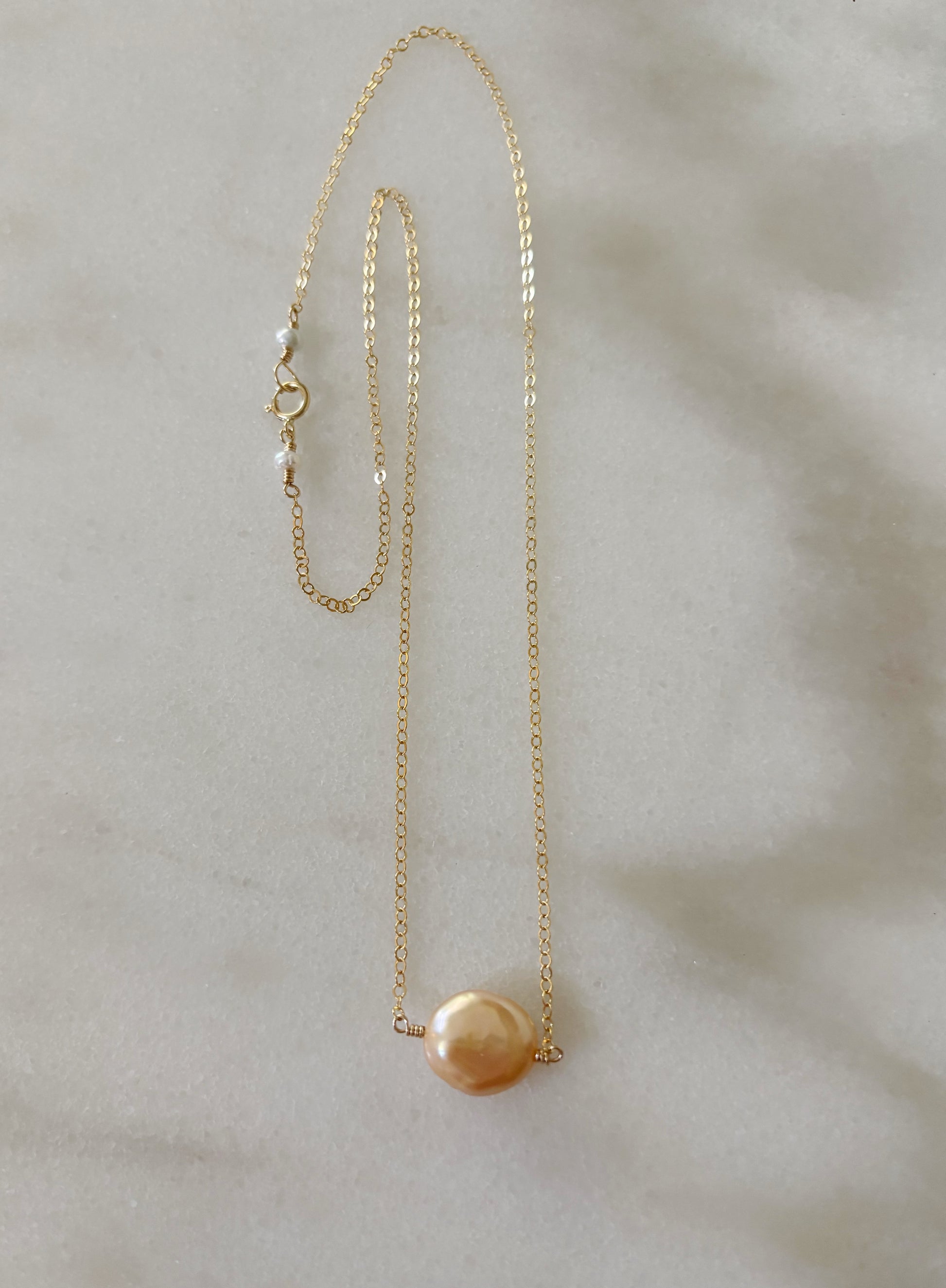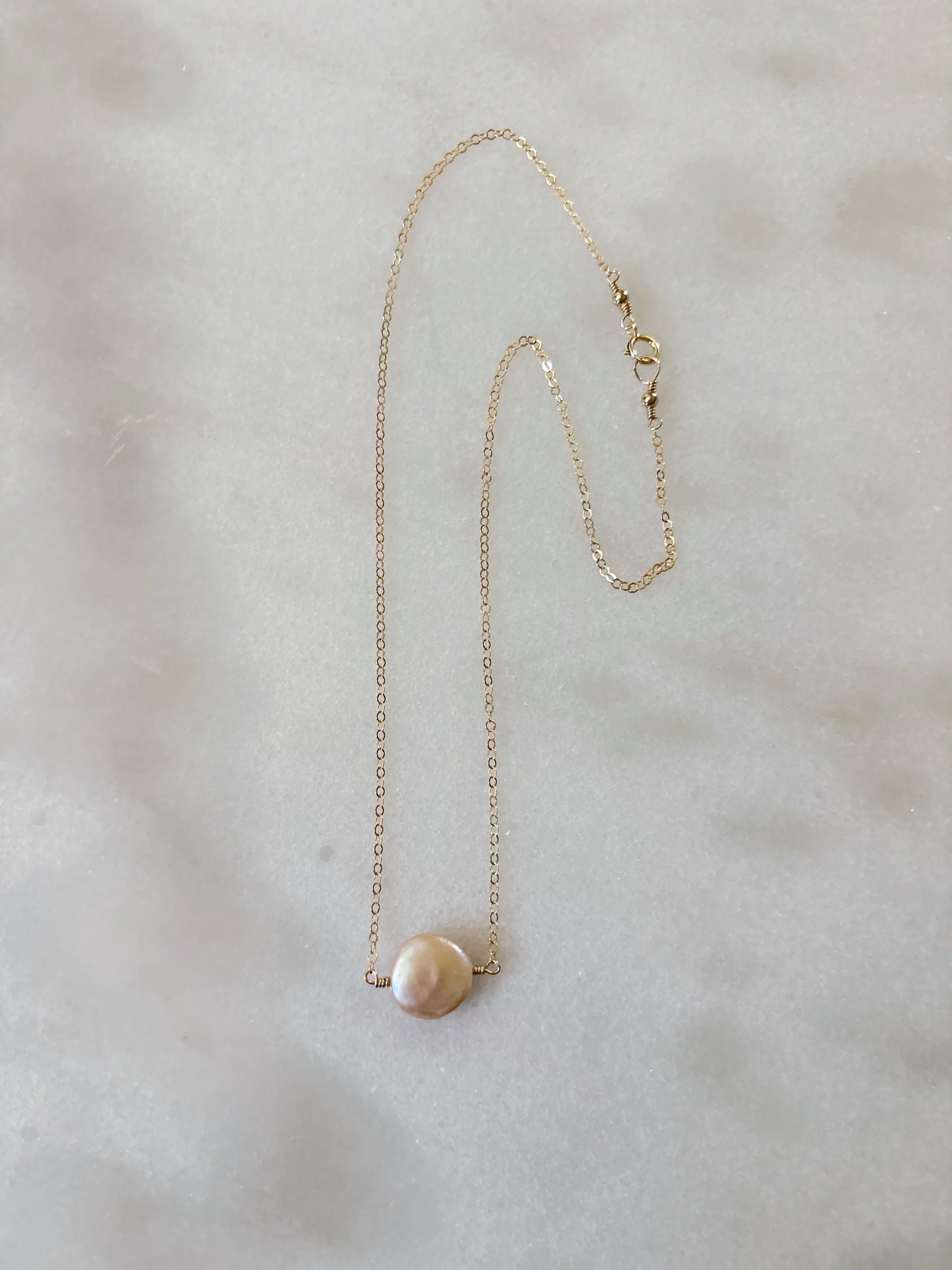 14k gold filled necklace with a baby pink coin pearl